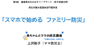 「防災」は、忙しい子育て中の方々には手をつけづらい分野かもしれません。私もそうでした。しかし、子育て中こそ家族の安全・安心を考えねばならない時期でもあります。