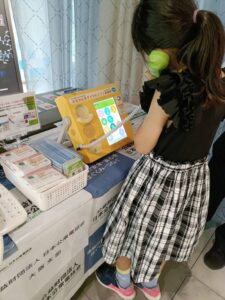 救命AED体験に、娘・初挑戦。心臓マッサージは「アンパンマンのマーチ」のリズムがちょうどいいそうです。